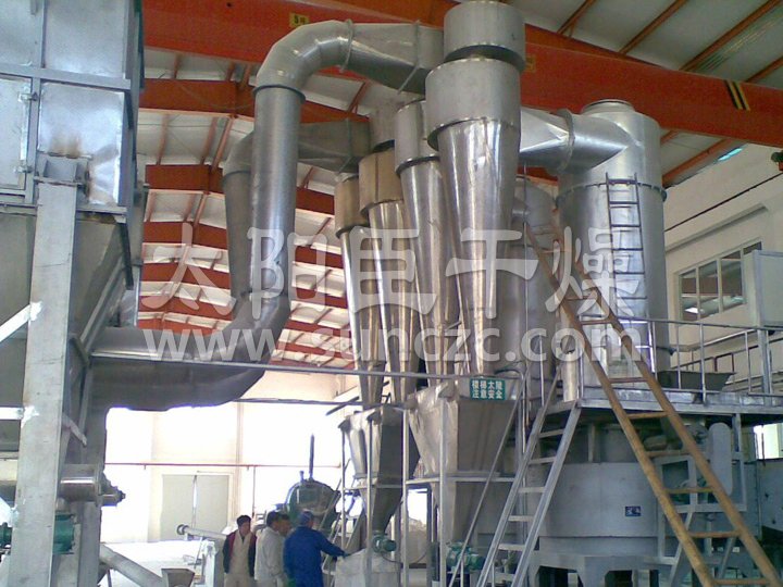 本機組工作過程為料液通過隔膜泵高壓輸入,噴出霧狀液滴,然后同熱空氣并流下降,大部分粉粒…
